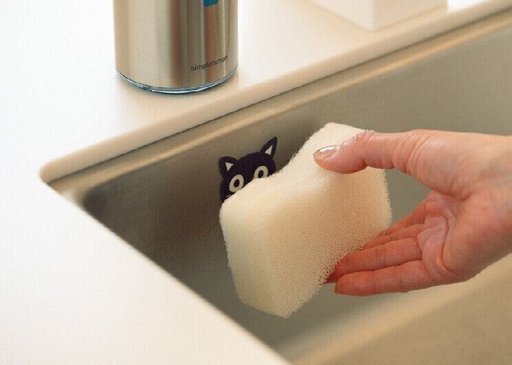ぬめりやすいスポンジ立ては、掃除が面倒なアイテムの代表格。でも、この面ファスナーのような質感のシールを使えば、スポンジがピタッと貼りつき掃除の手間がゼロに。