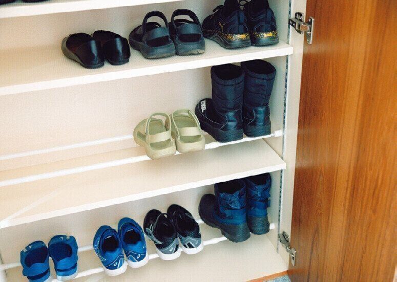 砂だらけの子ども靴を入れた段は、靴箱も砂で汚れがち。いちいち靴をどかして掃除しなくていいように突っ張り棒を2本渡し、その上に靴を置けば、底がさっと拭けてラク。