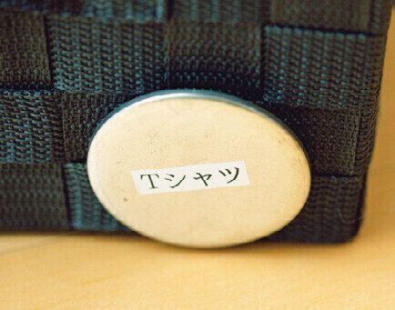 収納ケースにシールが貼れないときは、100均の缶バッジが便利。缶にラベルシールを貼りピンで留めて。