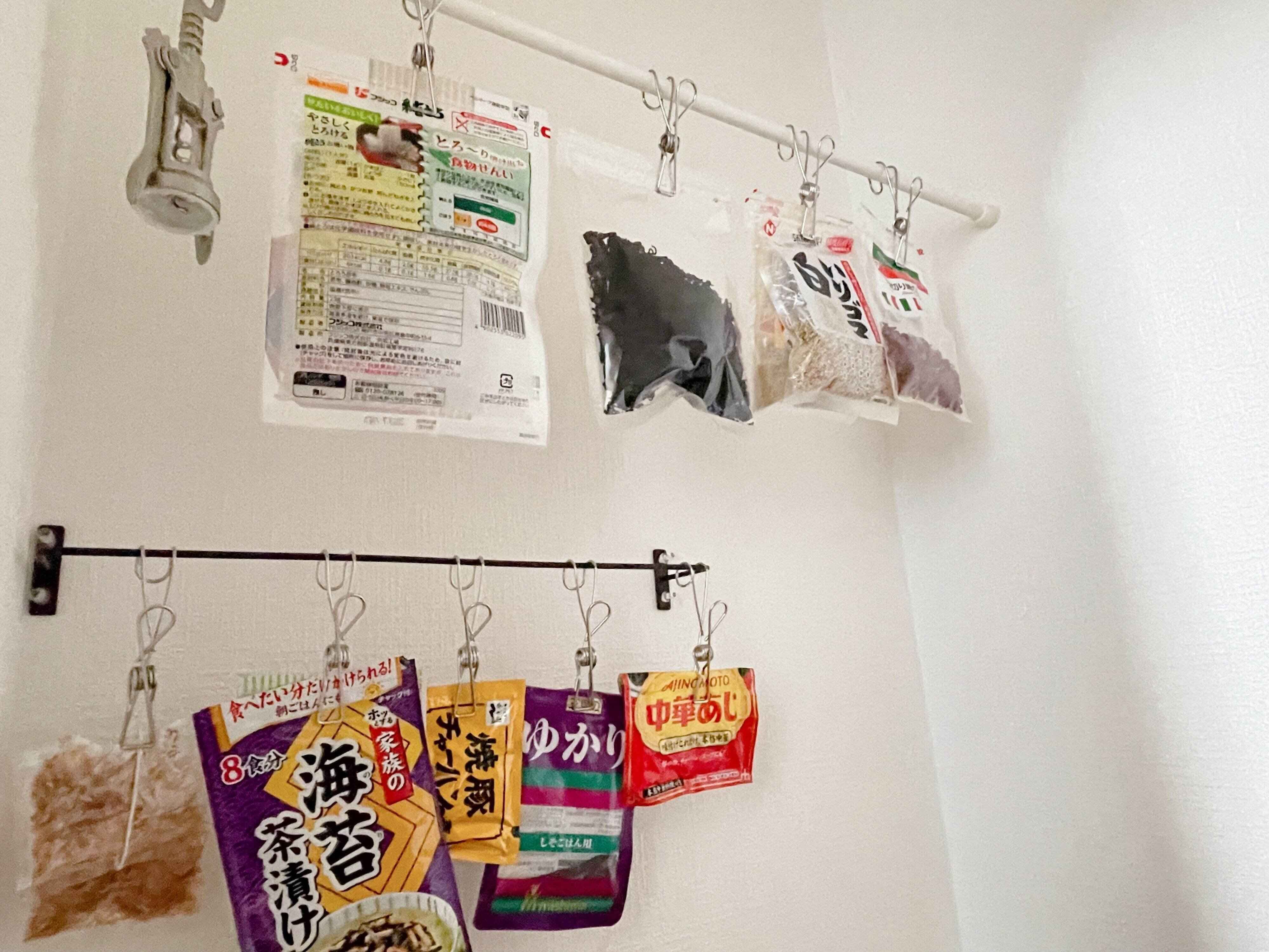 定番乾物であれば、吊り下げ収納にすると一目で何がどこにあるのか判断ができます。