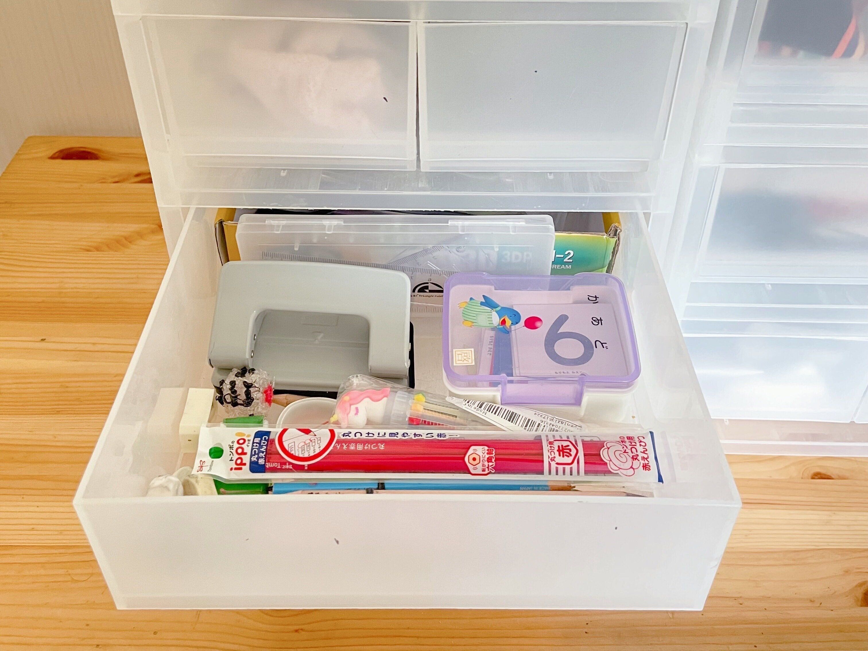 子ども専用のボックスには、なくしやすい消しゴムや鉛筆の予備、文房具などを入れておきます。