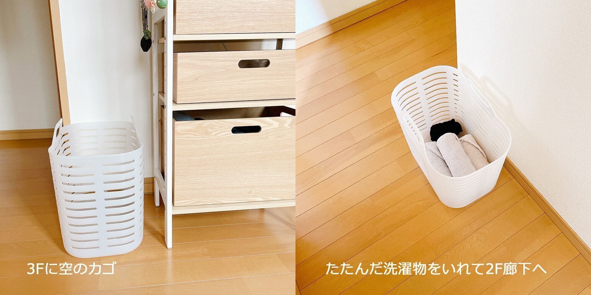 洗濯物を干したときに使ったカゴは3階に置いてあるので、1階へ持って行くものがあるときは、まずそのカゴにまとめて入れます。そして、このカゴは一時的に、リビングのある2階の廊下へ。