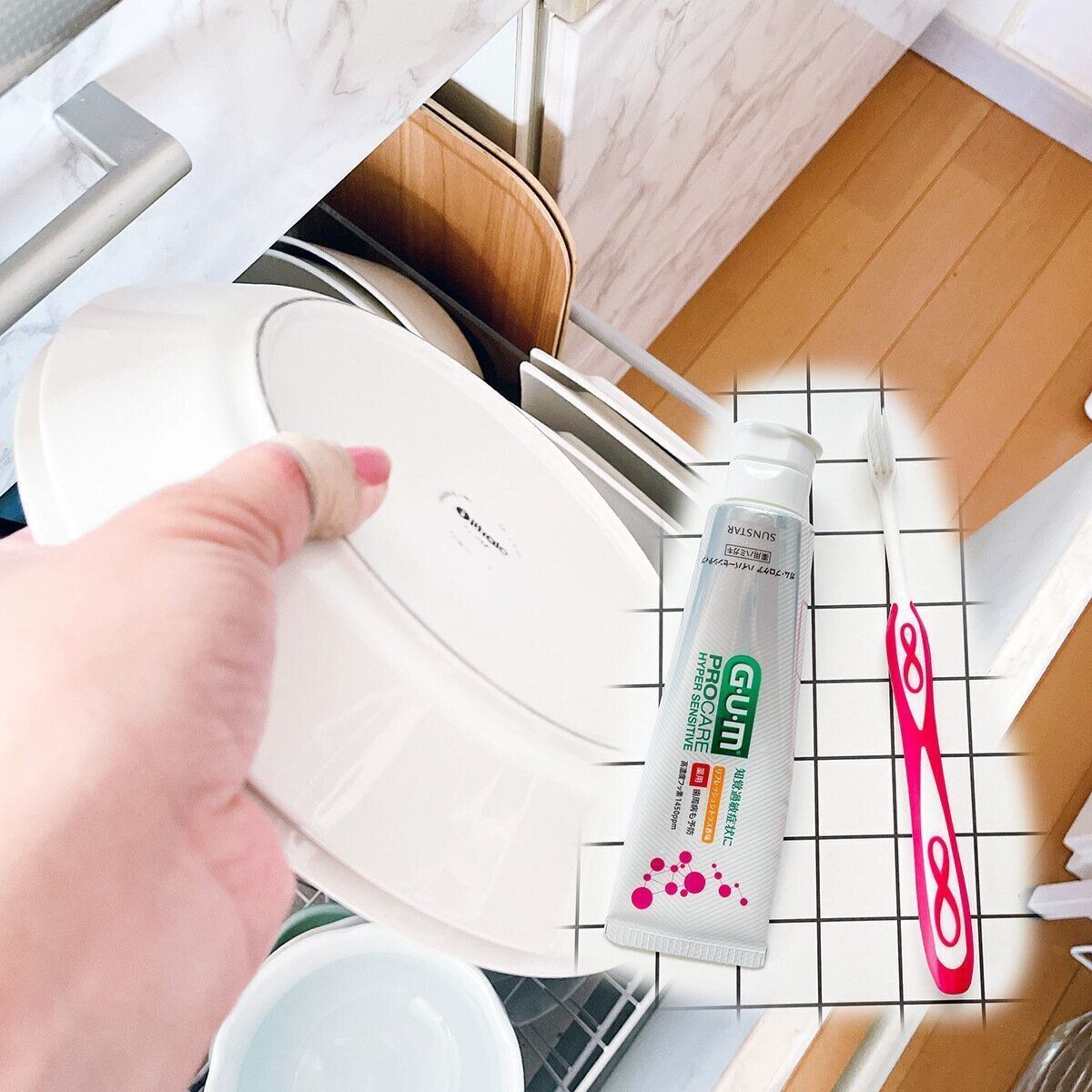 歯磨き中は利き手の右手はふさがっていますが、左手があいたまま。キッチンで歯磨きをするので、歯磨きしながら食洗機内の食器を片づけてしまいます。