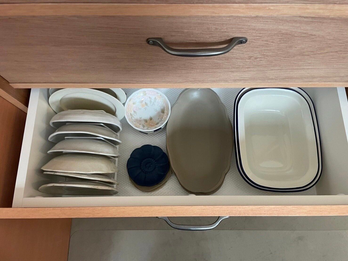 よく使うお皿は手前に置くのがおすすめです。引出しタイプの収納の場合は、写真のように、上から見た時にどんなお皿があるか分かる状態がベスト。収納グッズを使い、中皿を立てて収納するのもおすすめです。
