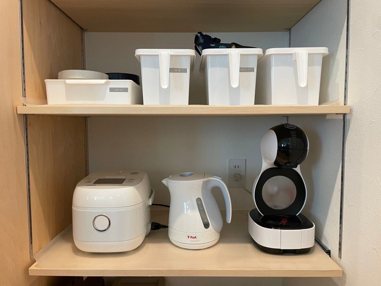 新築やリフォームを検討している方は、「既存の家電+将来必要になりそうな家電」 まで頭にいれて配置の検討をする必要があります。写真のように、必要な家電には専用の収納スペースを確保することが、キッチンを雑然とさせないコツです。