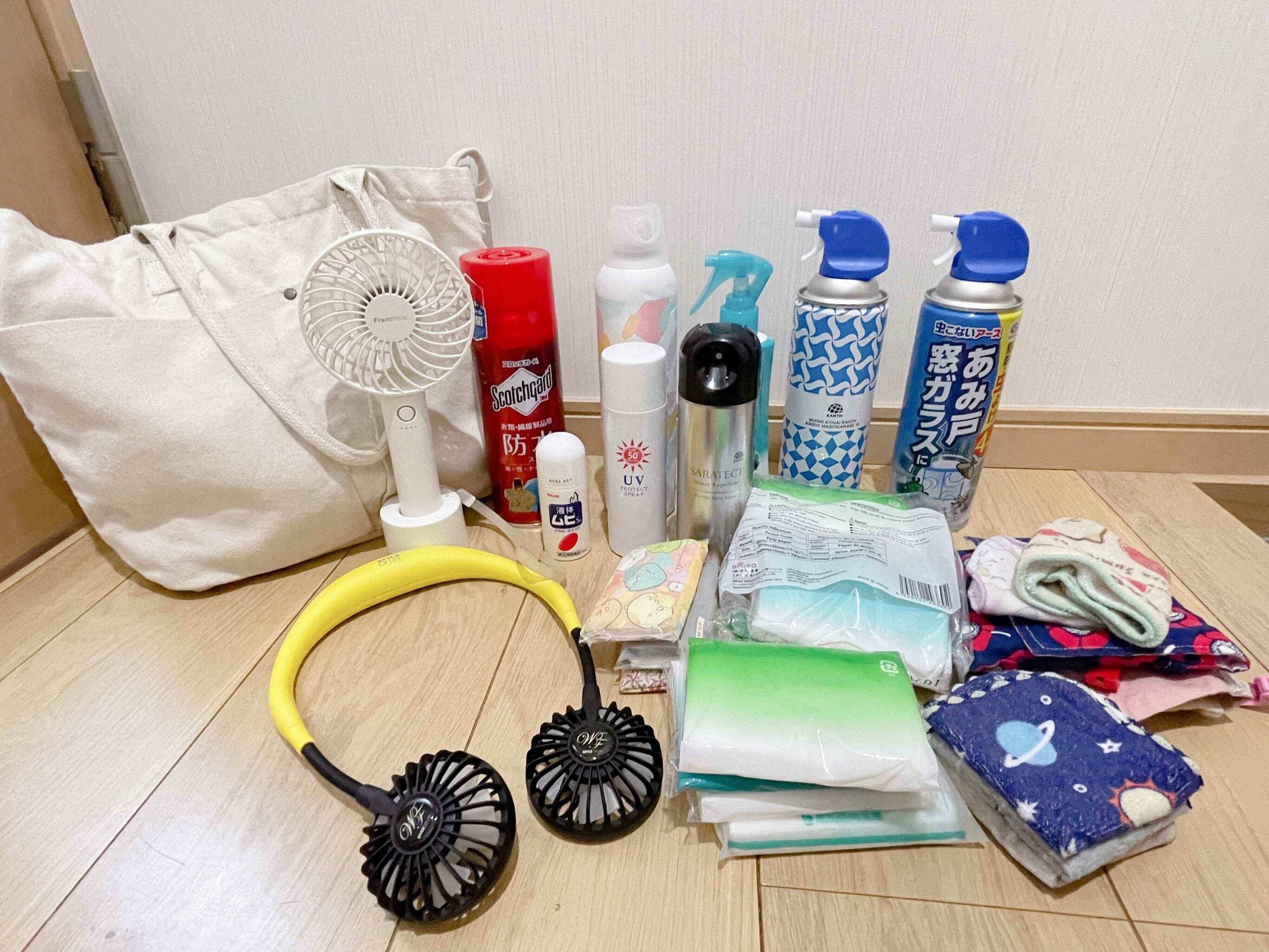 ニトリの「マルチポケットトートバッグ」の中には、「スプレー缶やボトル8本」「携帯扇風機2個」「ハンカチ&ティッシュ」など、多くのものを収納できました。