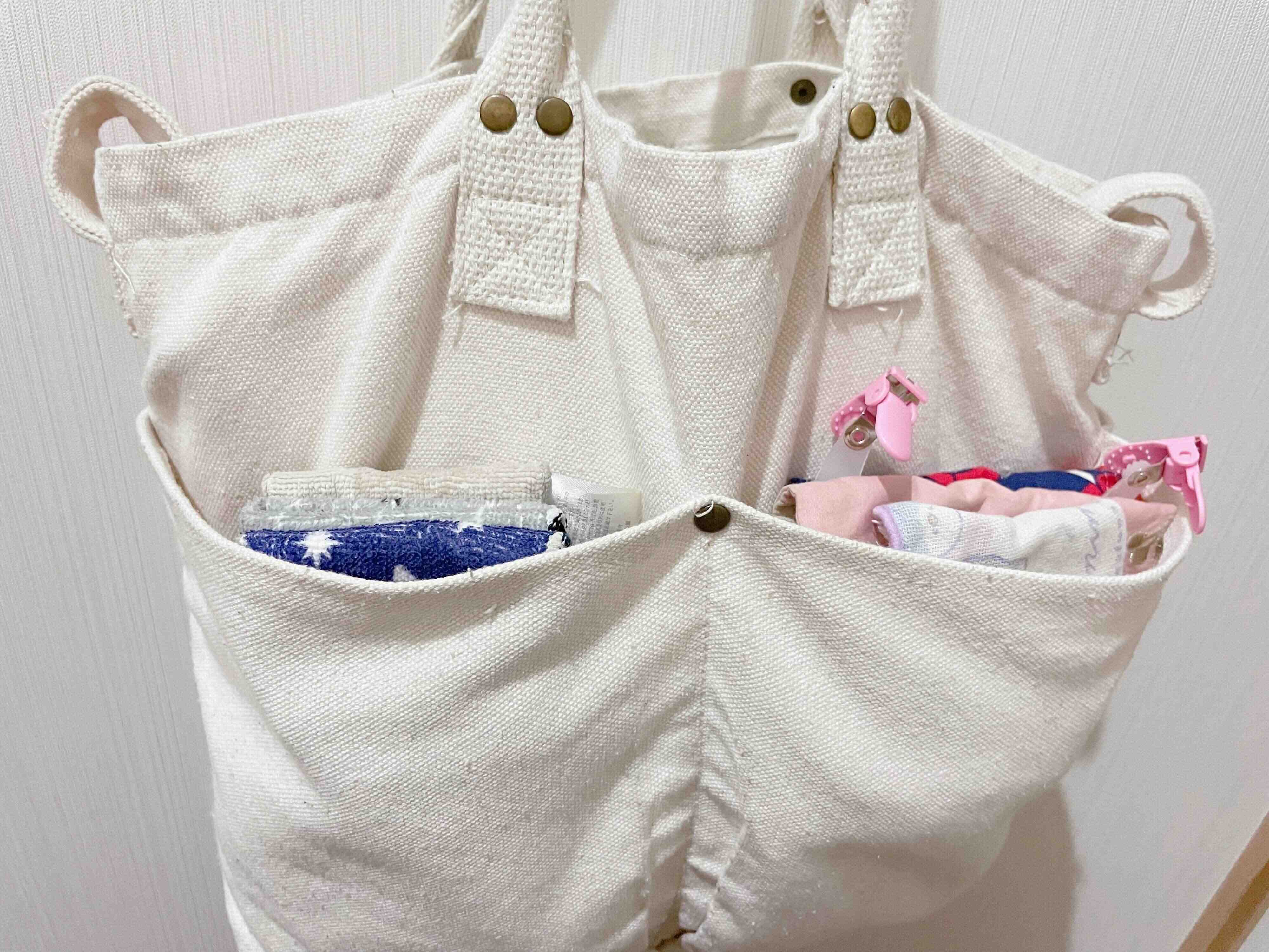 ニトリの「マルチポケットトートバッグ M」は、便利なポケットがたくさんついたトートバッグですが、今回は持ち運び用ではなく、あえて「収納用品」として使います。