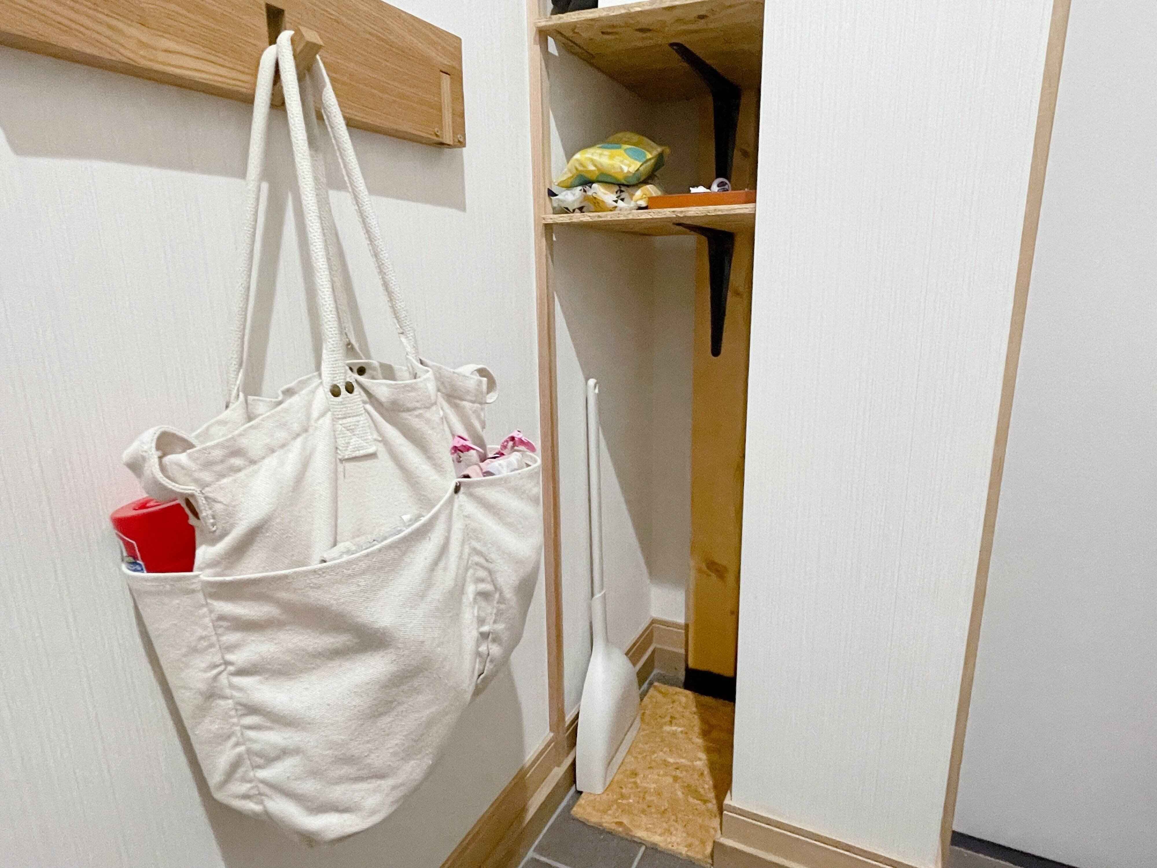 それらをひとつのバッグにまとめて玄関の壁に掛けておけば、子どもも基本は取ってくれますし、もし忘れていてもすぐに気づくことができます。