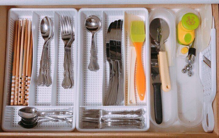 カトラリーはアイテムごとに分類して収納するのがおすすめです。カトラリーも必要以上に収納せずに、使っていないものや古くなってしまった物は処分し、適量を持つことで引き出しの中もすっきりします。