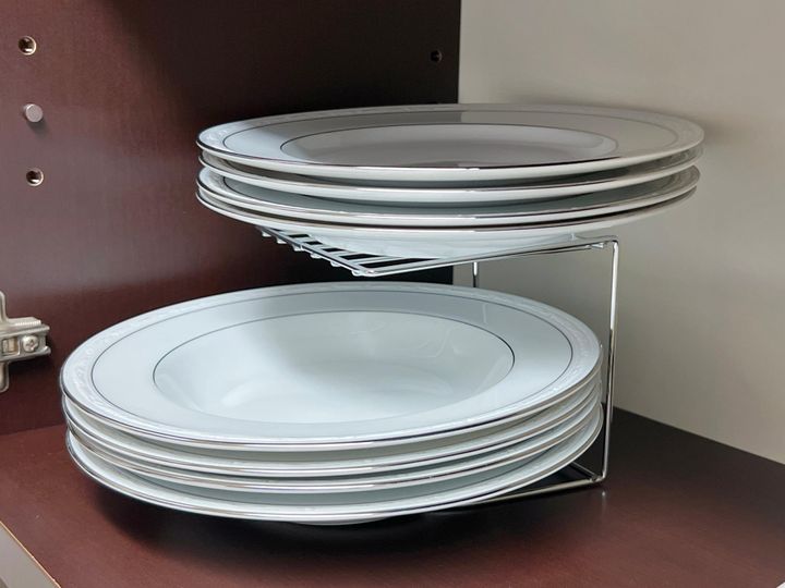サイズや種類の違うお皿を重ねて収納してしまうと、下に置かれたお皿は取り出しにくくなり、見栄えもよくありません。そんな場合はディッシュラックやコの字ラックなどを使い1段の棚を上下2段に仕切って種類ごとに収納します。食器棚の中の空間をむだなく活用でき、お皿の出し入れがスムーズになります。