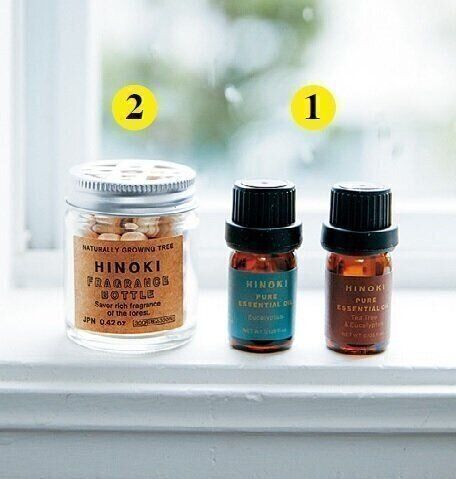 1【S】「ヒノキピュアエッセンシャルオイル」各¥550 2【S】「ヒノキのフレグランスボトル」¥330
