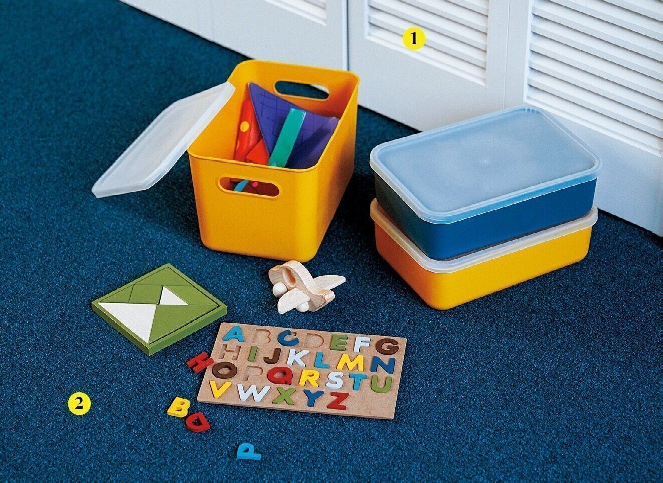 写真のイエローとブルー以外に、レッドやグリーンなどカラーバリエも豊富。「ふた付きが便利。小物類の収納に!」と西森さん。