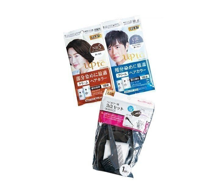 老舗ヘアケアメーカーと共同開発した「up to クリームヘアカラー」各¥110が登場。部分染めに最適で、カラーバリエも豊富。「ヘアカラー用3点セット」¥110とセットで使用して。