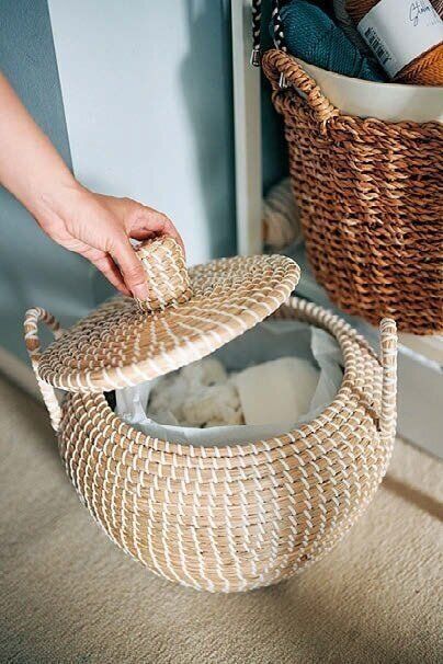 リビングとキッチンの間に置くゴミ箱を探したものの、「プラスチック製は違う」と、納得いく物を見つけられず。そこで元からあったふたつきかごをゴミ箱に!