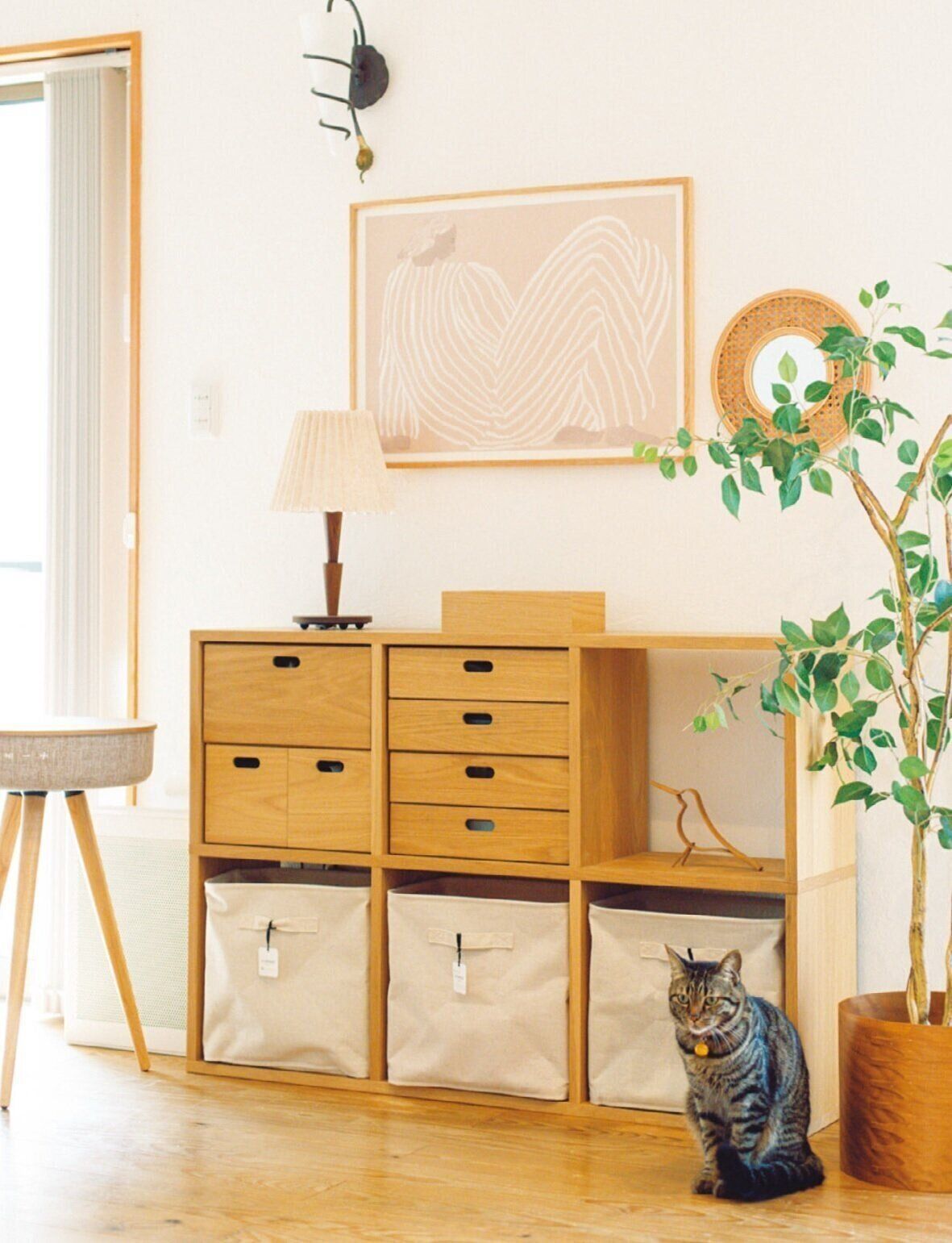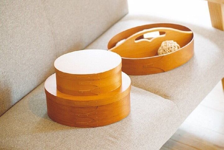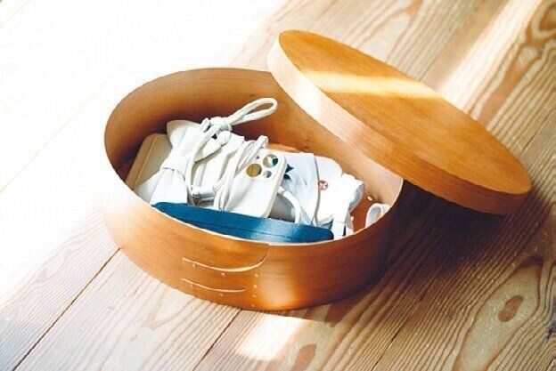 薄い木材を曲げたシェーカーボックスは、北欧インテリアの人気アイテム。「使っていないスマホケースなどの一時保管として活用しています。手軽に収納でき、そのまま置きっ放しでもおしゃれ!」。