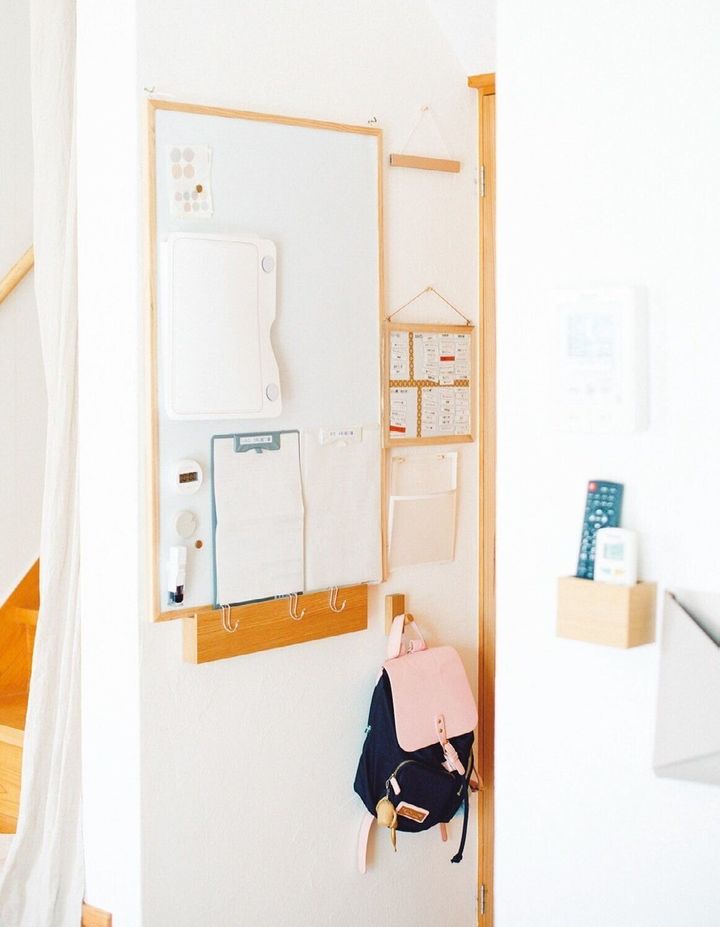 学校関連のプリント類はすぐ見える所に置きたいけれど、目立ちすぎるのは避けたい。そこで、階段横の凹んでいて見えづらい壁面にホワイトボードを取り付けて、チェックしやすくしています。