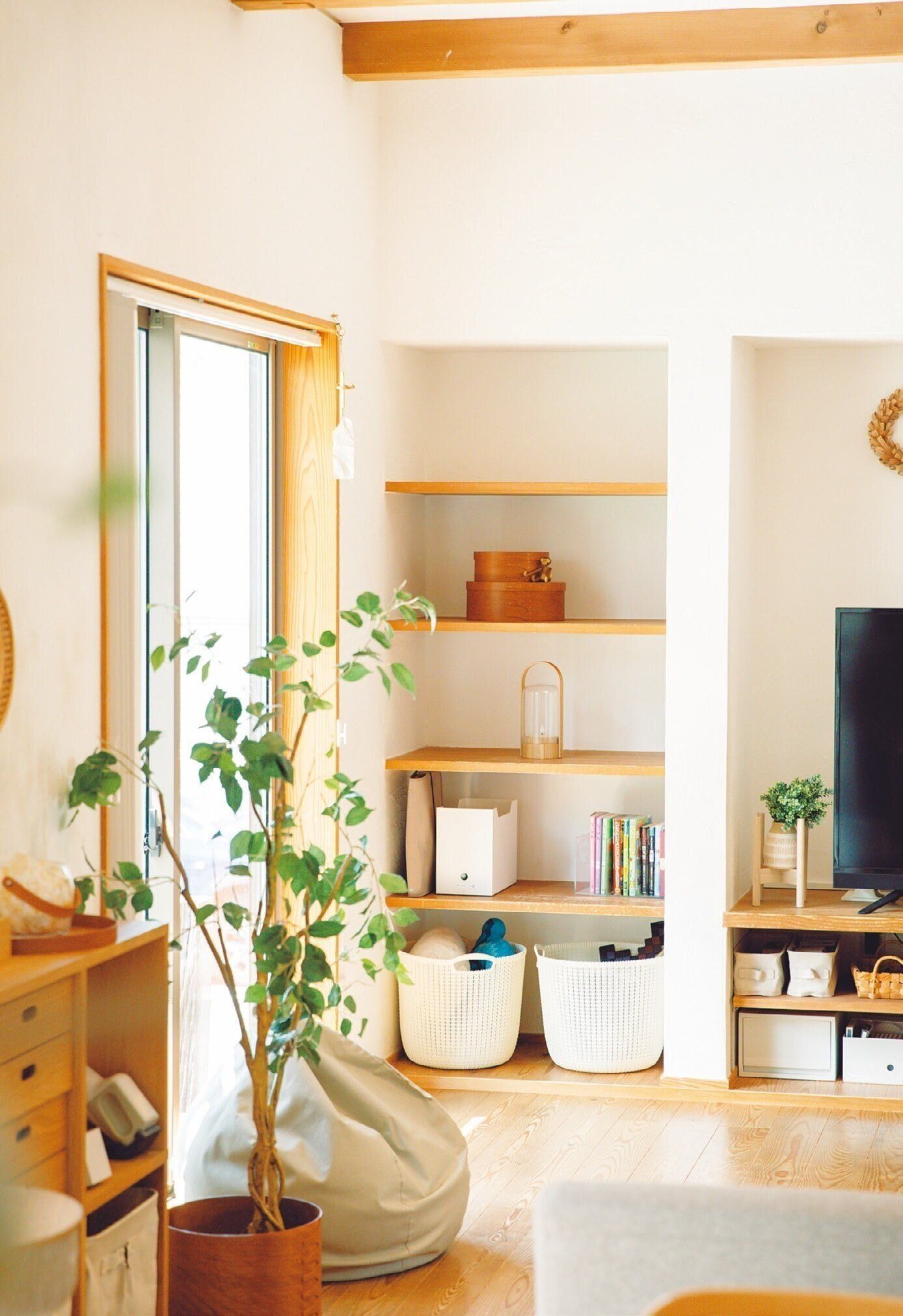 リビングのオープン棚をすべて収納に使うと圧迫感が出るので、両サイドの棚の上2段には“見せる”箱やかごだけに。余白があることで、雑貨がより引き立ちます。