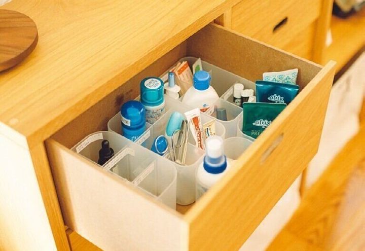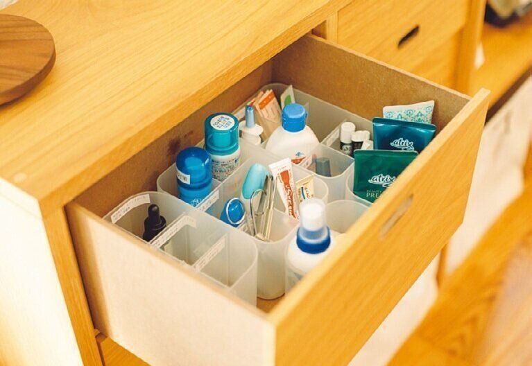 家族みんなが使う薬類などは、フォーカルポイントの下にある無印良品のラックに集約。「引き出しの中は100均のケースで仕切り、どこに何があるかひと目でわかるようにしています」。