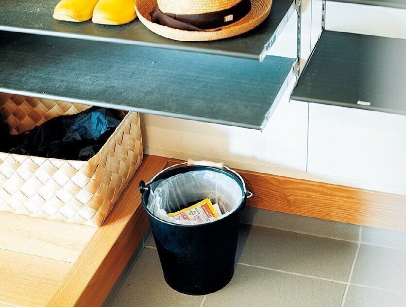 「ポスト内のチラシなどを室内に持ち込んで棚の上に置いたら最後、ずっとそこに居座る可能性が!だからなるべくリビングに持ち込まないって決めてます」。目を通したら玄関のたたきに置いたゴミ箱へ。