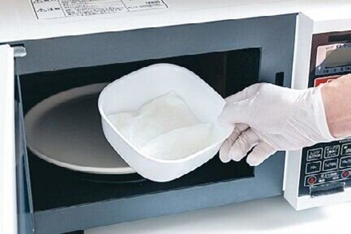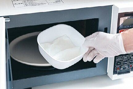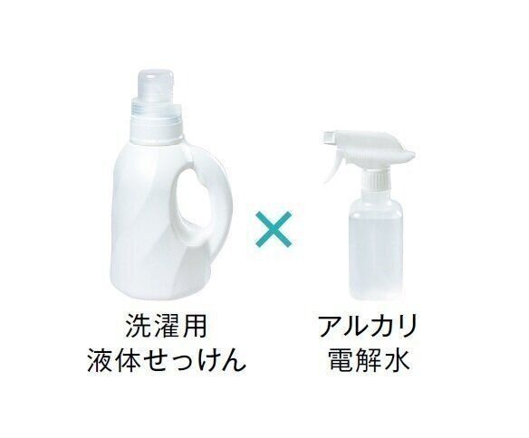 (1)耐熱容器に洗濯用液体せっけん10ml、アルカリ電解水190mlを入れて混ぜ、500Wの電子レンジで2分加熱してミックス洗剤を作る。ペーパータオル2枚を浸す。