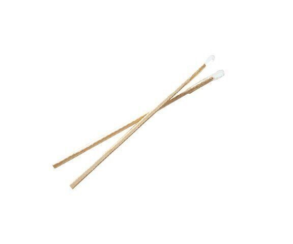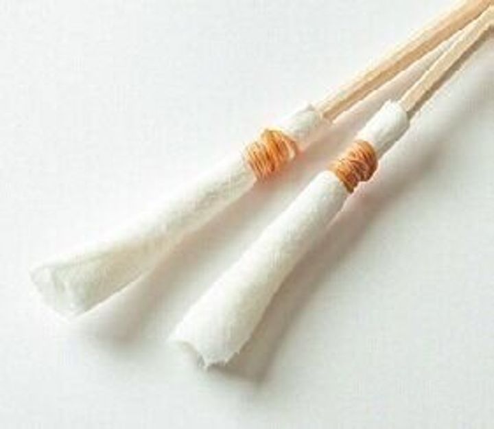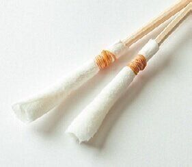 厚手のペーパータオルをはさみで5×10cmに切り、割りばしの先に巻いて輪ゴムで固定する。