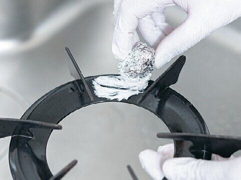 ホイルを適当な大きさに丸めた「ホイルたわし」にクレンザーをつけ、五徳の焦げつき部分をこする。水洗いし、水けを拭いて戻す。