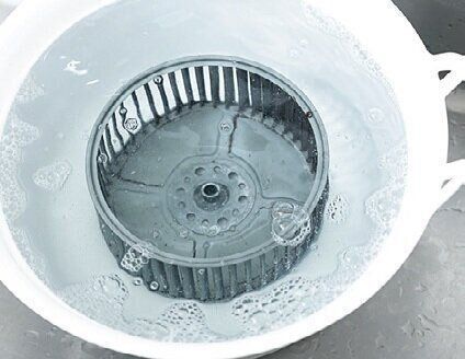 つけ置き後、ファンをたらいの水につけながら、古歯ブラシで残っている汚れをこすり落とす。ファンと他のパーツを中性洗剤で洗い、水けを拭いて戻す。