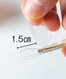 (2)割りばしの先に輪っか状にした(1)が1.5cm出るようにして、テープでしっかり固定する。テープは5周ずつ2カ所巻いて、絶対外れないようにする。
