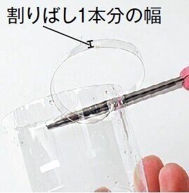 (1)はさみでペットボトルを半分に切り、さらに割りばし1本分の幅になるよう細長く切る。