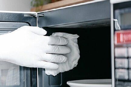 (2)やけどしないよう厚手のゴム手袋をし、2枚重ねて4つ折りにしたペーパーで庫内を拭く。冷蔵庫の上や家電についた汚れにも◎。