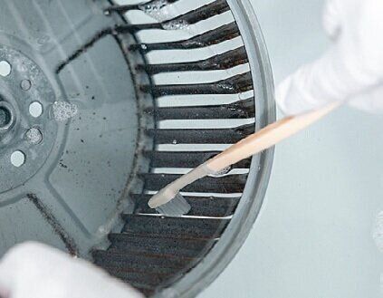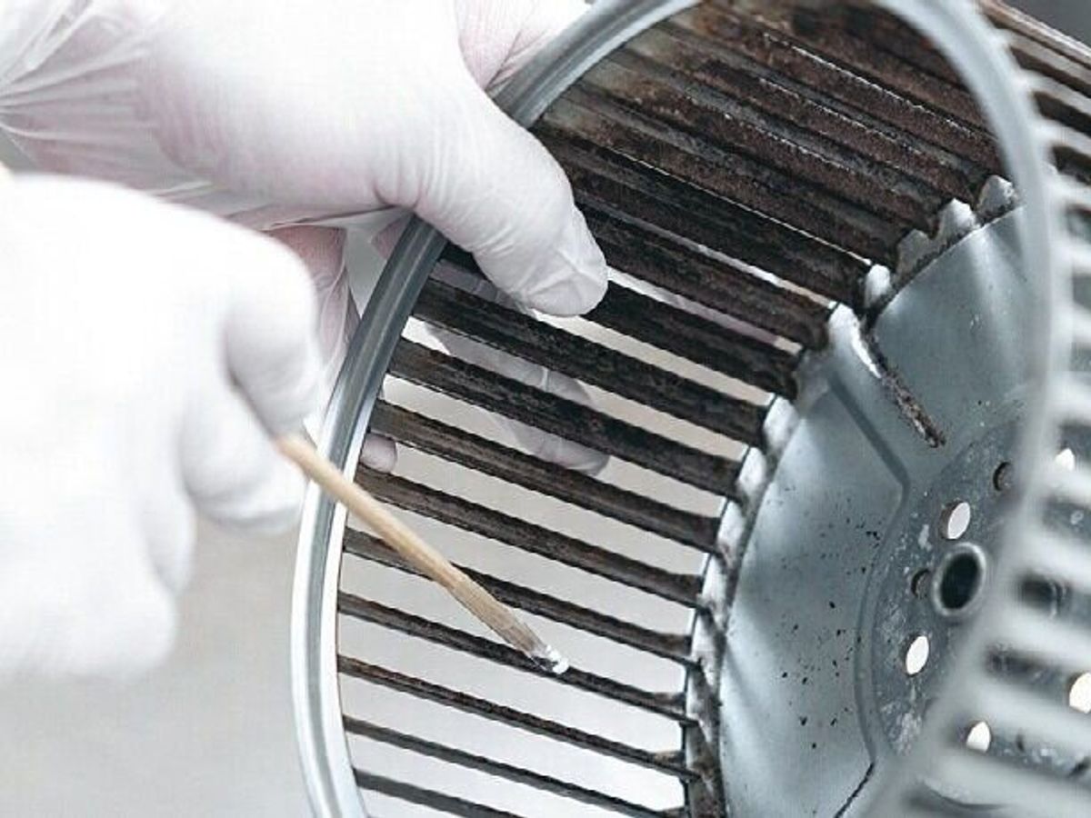 1 自作のこそげ落とし棒でファンの溝の汚れを落とす