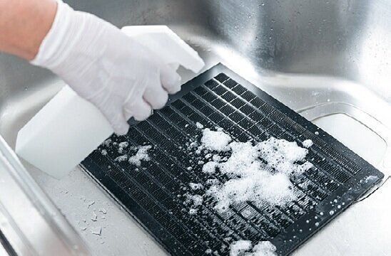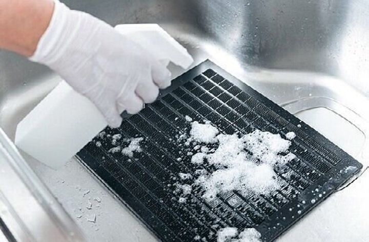 ホット洗剤を作り、フィルターの裏表にスプレーし、ペーパータオルでこするように拭き取る。シンクで水洗いし、水けを拭いて戻す。