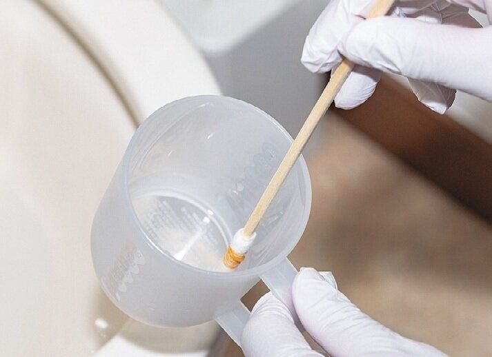 2 自作のぬりつけブラシを塩素系漂白剤に浸す