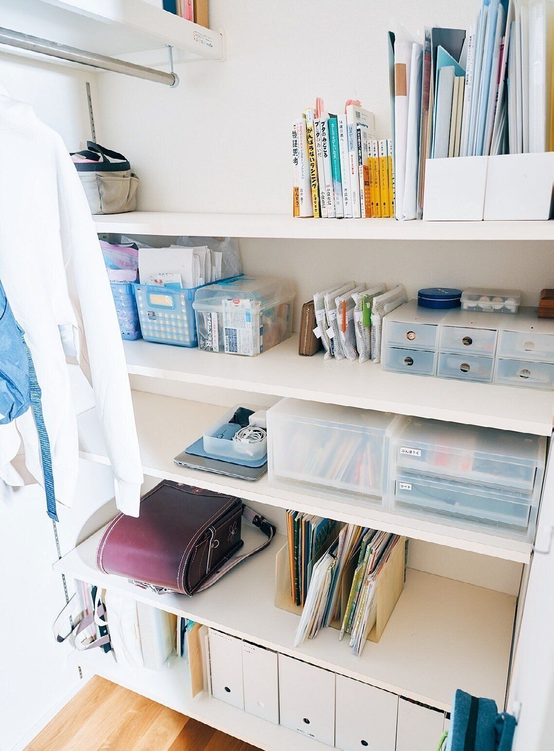 リビングに隣接する1畳半のクローゼットに、家族がリビングでよく使う物をひとまとめ。「小2の長男は着替えも宿題もリビングでするので、服や学用品もここにしまっています」。