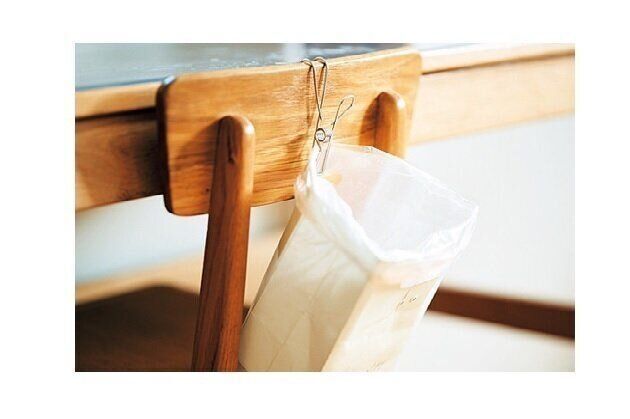 ゴミ箱代わりの紙袋にポリ袋をセットし、ピンチつきのフックでイスの背に。省スペースで掃除もしやすい!