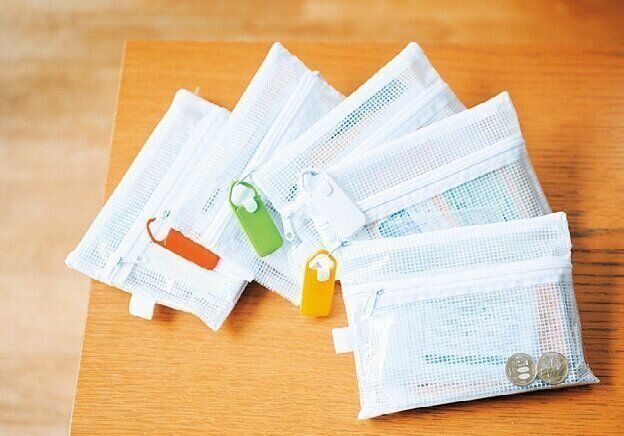 セリアのファスナーつきポーチに名札をつけ、診察券やお薬手帳、保険証、小銭などを人別にセット。「いざというとき、夫や近くに住む私の母にもひと目でわかるようにしています」。