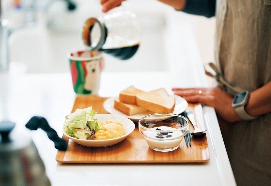 5人分の食器を片づけるのは手間がかかるので、朝食も夕食も1人分ずつニトリの大判トレーにまとめて配膳するスタイルに。「食べ終わった食器をシンクに戻す作業がラクになりました」。