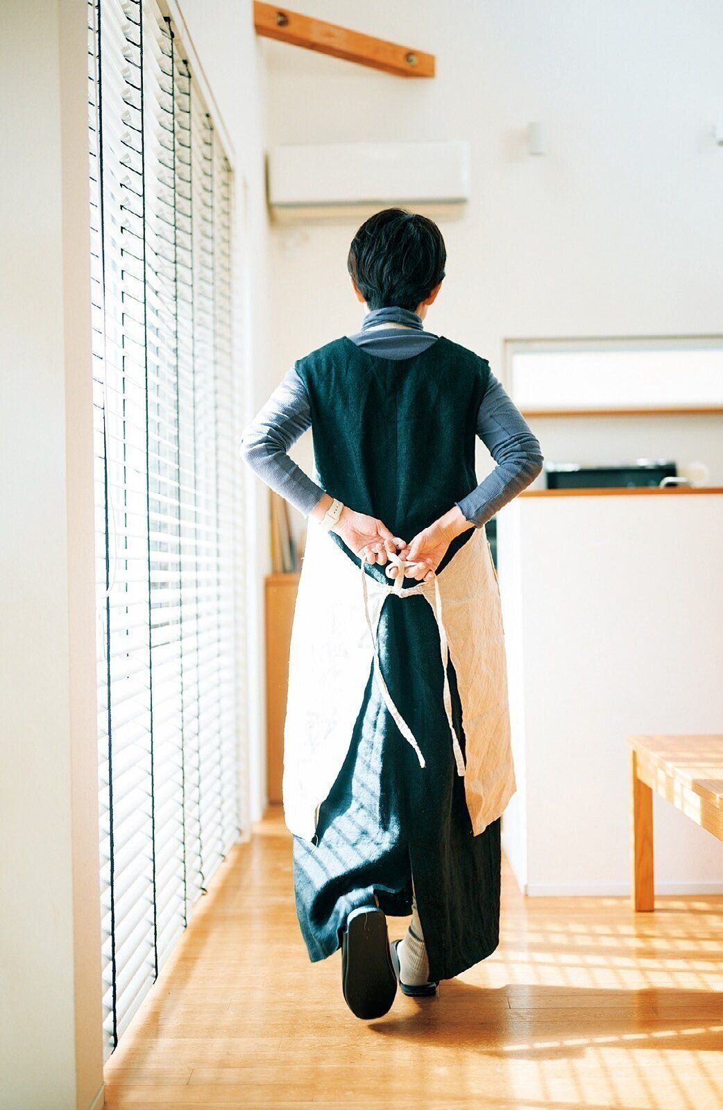 共働きで多忙だから、平日は朝晩の簡単なリセットで頑張りすぎず、週末の午前中を片づけタイムに充てています。「私の場合、エプロンをつけるとやる気スイッチがオンに!」。