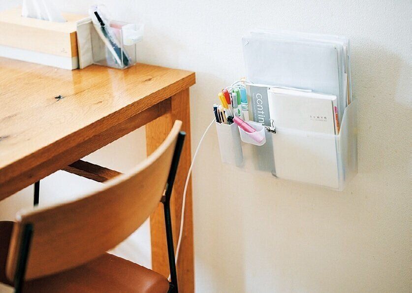 毎日座る場所の横の壁に100均の石膏ボード用フックでBOXを引っ掛け、子どものプリント類を収納。筆記具や手帳、提出物に押すための印鑑もここに集めるとサッと取れてラク!