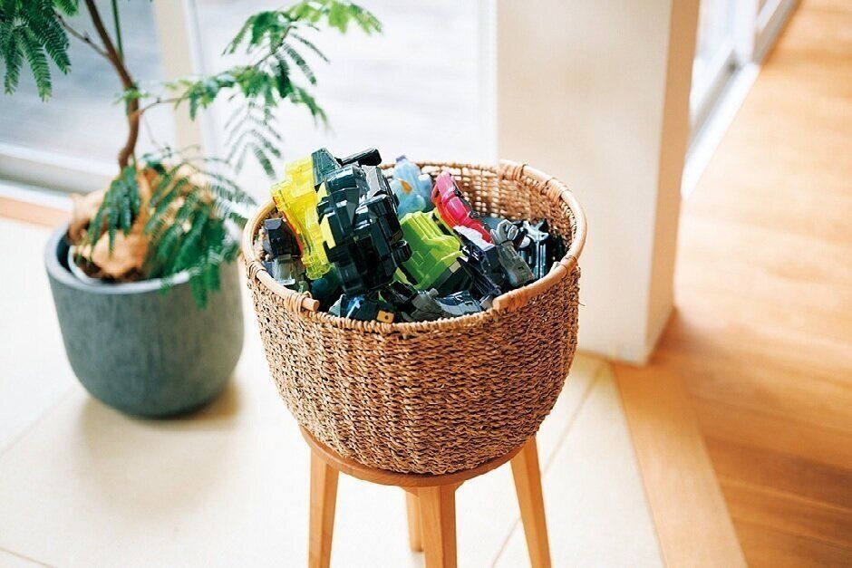 定期的におもちゃの量を見直し、カゴに入るだけに限定。「フリマアプリで使わないおもちゃを売り、その売上金を子どものお小遣いにしたら、積極的に手放してくれるように」。
