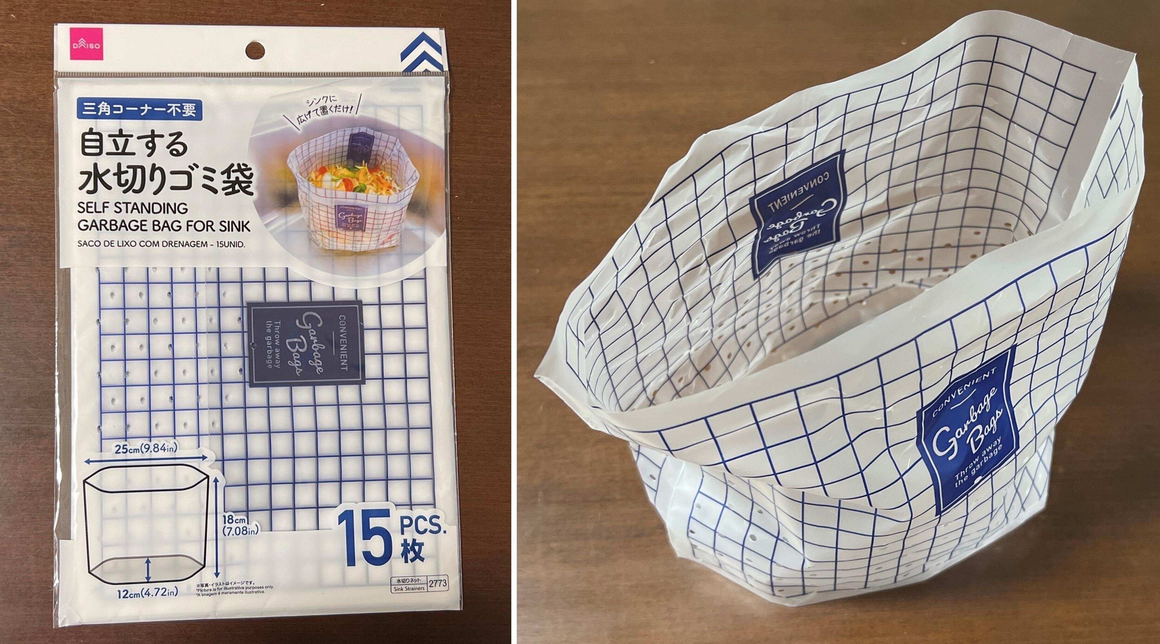 ちなみにわが家ではダイソーの「自立する水切りゴミ袋」(110円/12枚入)を使っています。