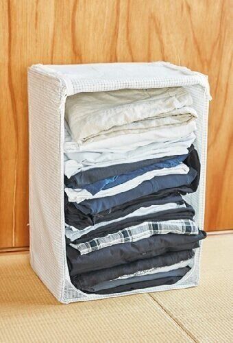 シミがついた服やくたびれた服を一掃。ボトムスやトップスなど、種類ごとに重ねるとわかりやすい。