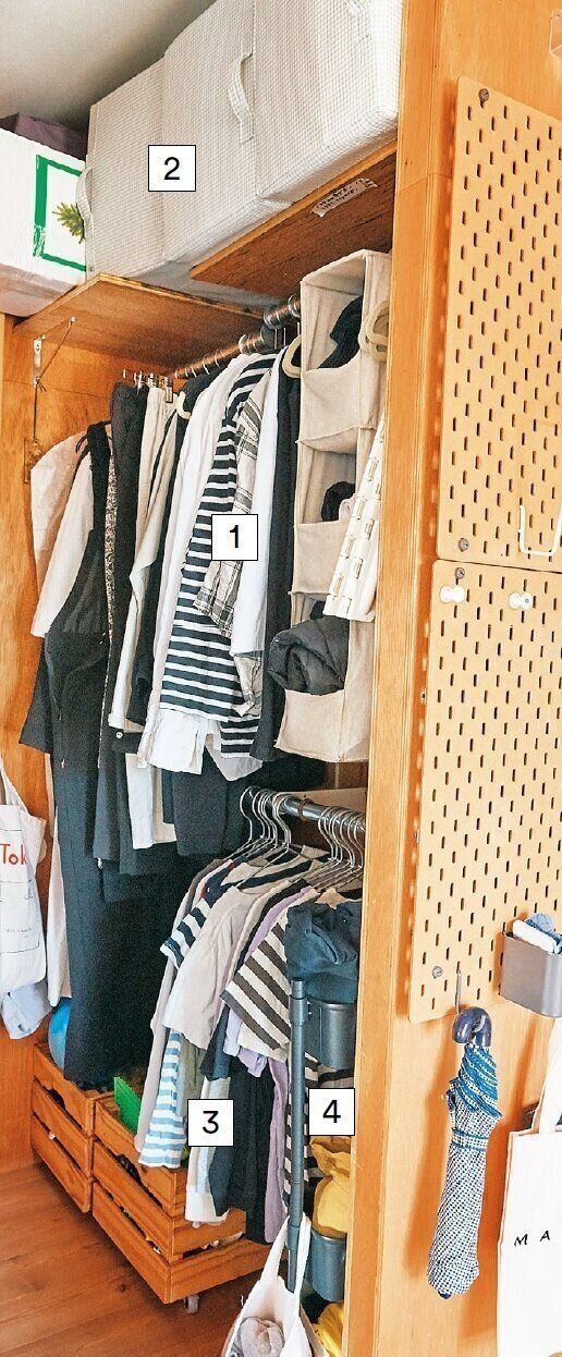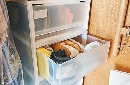 (1)あまり着ない服は引き出しへ。肌寒い日用や1軍用のラックにかかり切らない服は、引き出しでスタンバイ。
