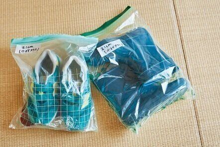 (2)子どもの服や靴はサイズをラベリングしておくと管理しやすい。サイズアウトしやすい子どもの靴は、1足ずつラベリング。状態がよいものは弟へお下がりにまわすので、どのサイズがあるかわかりやすく管理。