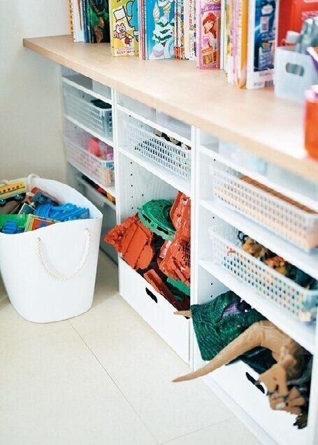 リビングの細かなおもちゃは中身が見える半透明のケースで分類すれば、ラベルがなくても早わかり。大きなおもちゃもあえて中身が丸見えの浅いケースに収納し、わかりやすさを優先。