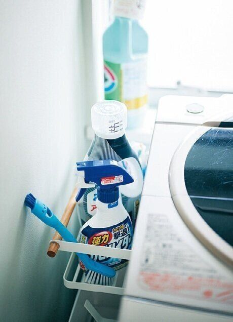 「前は洗剤をおしゃれな容器に入れ替えていたけれど、結局メーカーのボトルが一番使いやすいという結論に」。洗濯機側面の死角に置けば目につかないし、面倒な入れ替え作業も不要に!