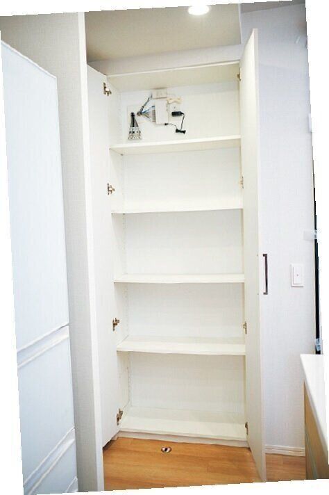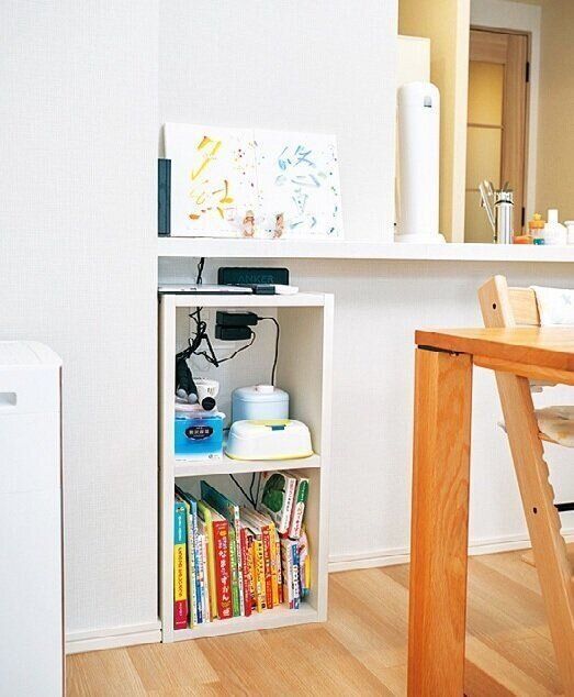 食器類はキッチン内に移動し、ここには主に食材や水のストックを収納。さらに上から2段目にリビングでよく使う物の置き場を設けて散らかりを防止。