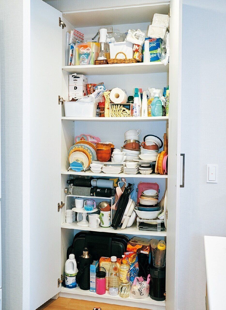 キッチンにもリビングにも近くて一番よく開ける場所。でも食器や食材、日用品が入り混じってゴッチャリ!「食器がここって……料理を盛るために何歩歩くの(笑)」(純子さん)