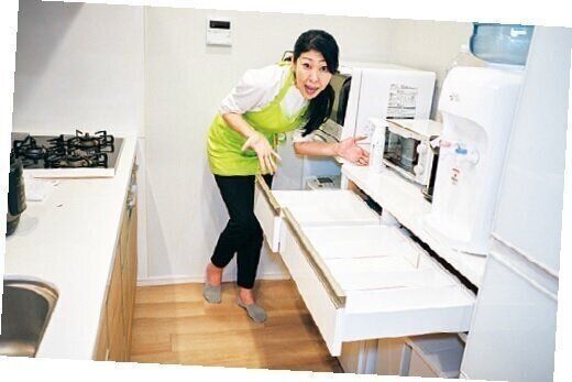 「全然使ってない割り箸をトップ・オブ・ザ・ゴールデンにしまうのはもったいない!ここは炊飯器や作業台に近いから毎日使う食器をしまうのにぴったり。これで盛りつけもラクになるわよ~」。