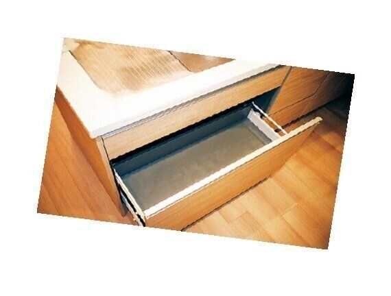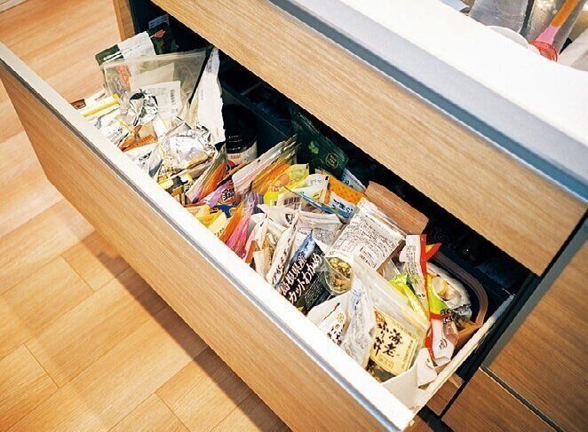 シンクで立ったまま物が取れる超便利な引き出しがストック食材でパンパン。「底の方にも食材が大量に埋まってる~。見えない物は“ない”のと同じよ」。